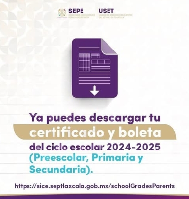 Los interesados podrán consultar e imprimir su boleta y certificado en la liga: https://sice.septlaxcala.gob.mx/schoolGradesParents.