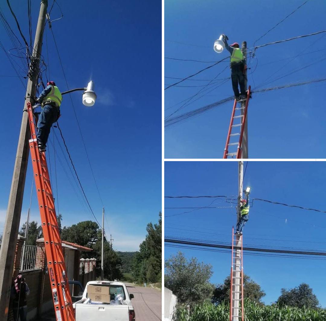 La Brigada de Alumbrado Público de Yauhquemehcan realiza trabajos de rehabilitación en la red de iluminación de San Francisco Tlacuilohcan.