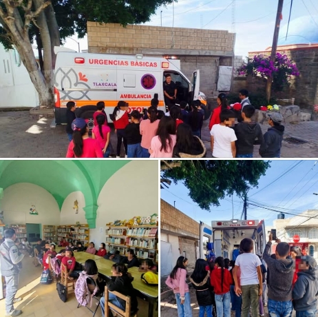 El personal operativo de Protecciรณn Civil integrado por TAMP-B: ๐๐ฒ๐รบ๐ ๐๐ผ๐ป๐ฑ๐ฒ ๐ฅ๐ผ๐บ๐ฒ๐ฟ๐ผ, ๐ฒ๐ป๐ณ๐ฒ๐ฟ๐บ๐ฒ๐ฟ๐ฎ: ๐๐๐ฒ๐น๐๐ป ๐ฅ๐ผ๐ท๐ฎ๐ ๐ฉรก๐๐พ๐๐ฒ๐, ๐ง๐๐ ๐ฃ-๐: ๐ ๐ฎ๐๐ฟ๐ถ๐ฐ๐ถ๐ผ ๐๐ฟ๐๐ ๐๐ฒ๐ฟ๐ป๐ฎ๐น, ๐ฃ. ๐ฉ: ๐๐ฒ๐๐ถ ๐๐ด๐๐ถ๐น๐ฎ๐ฟ ๐๐น๐ผ๐ฟ๐ฒ๐ arribaron al Curso de Verano que ofrece la presidencia de comunidad de Acxotla del Rรญo, dirigido a niรฑas y niรฑos, a quienes les dieron una demostraciรณn y explicaciรณn del funcionamiento de la ambulancia.