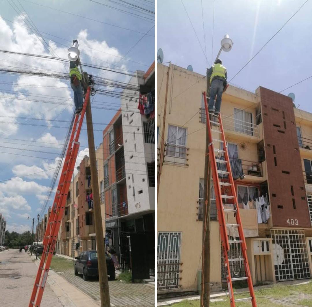 La Brigada de Alumbrado Público lleva a cabo trabajos de rehabilitación y mantenimiento en la Unidad Habitacional Jardines del Sur en la comunidad de Huacaltzingo.