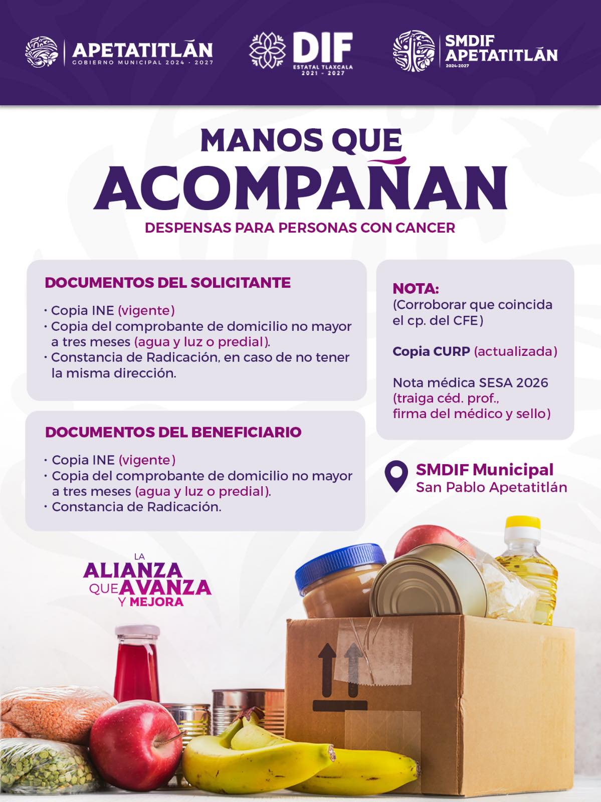 Porque nadie debería enfrentar el cáncer en soledad, desde el SMDIF Apetatitlán ponemos en marcha el programa de despensas para personas con cáncer, brindando apoyo alimentario a quienes más lo necesitan.