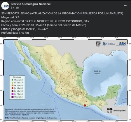 El Servicio Sismológico Nacional informa de manera preliminar la ocurrencia de un sismo de magnitud 5.7, localizado a 19 kilómetros al Noreste de Puerto Escondido, Oaxaca.