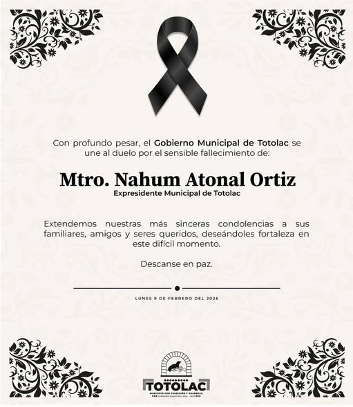 El Gobierno Municipal de Totolac 24-27 que encabeza el presidente municipal Benjamín Atonal Conde se une al duelo por el lamentable fallecimiento del Mtro. Nahum Atonal Ortiz quien fue presidente municipal de Totolac en la administración 2002-2005 y ex diputado local.