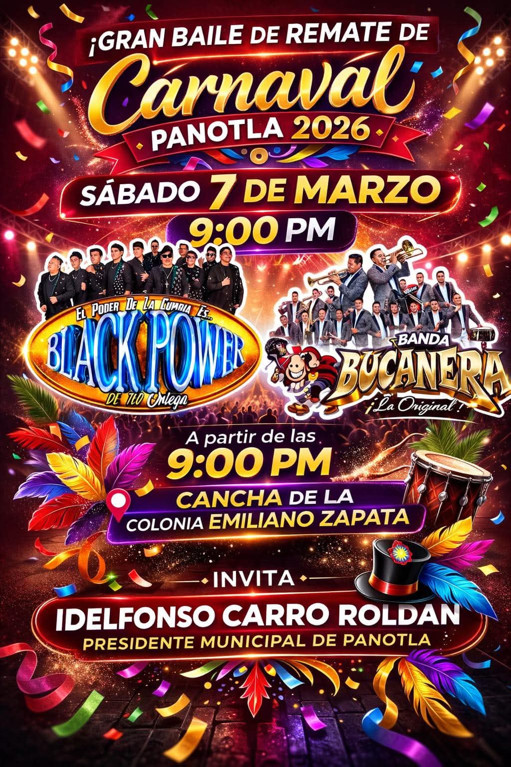 Como parte de las actividades que dan cierre a una de las tradiciones más representativas del municipio, el Ayuntamiento de Panotla invita a la ciudadanía y visitantes al Gran Baile de Remate del Carnaval Panotla 2026, que se llevará a cabo el próximo sábado 7 de marzo a partir de las 9:00 de la noche.