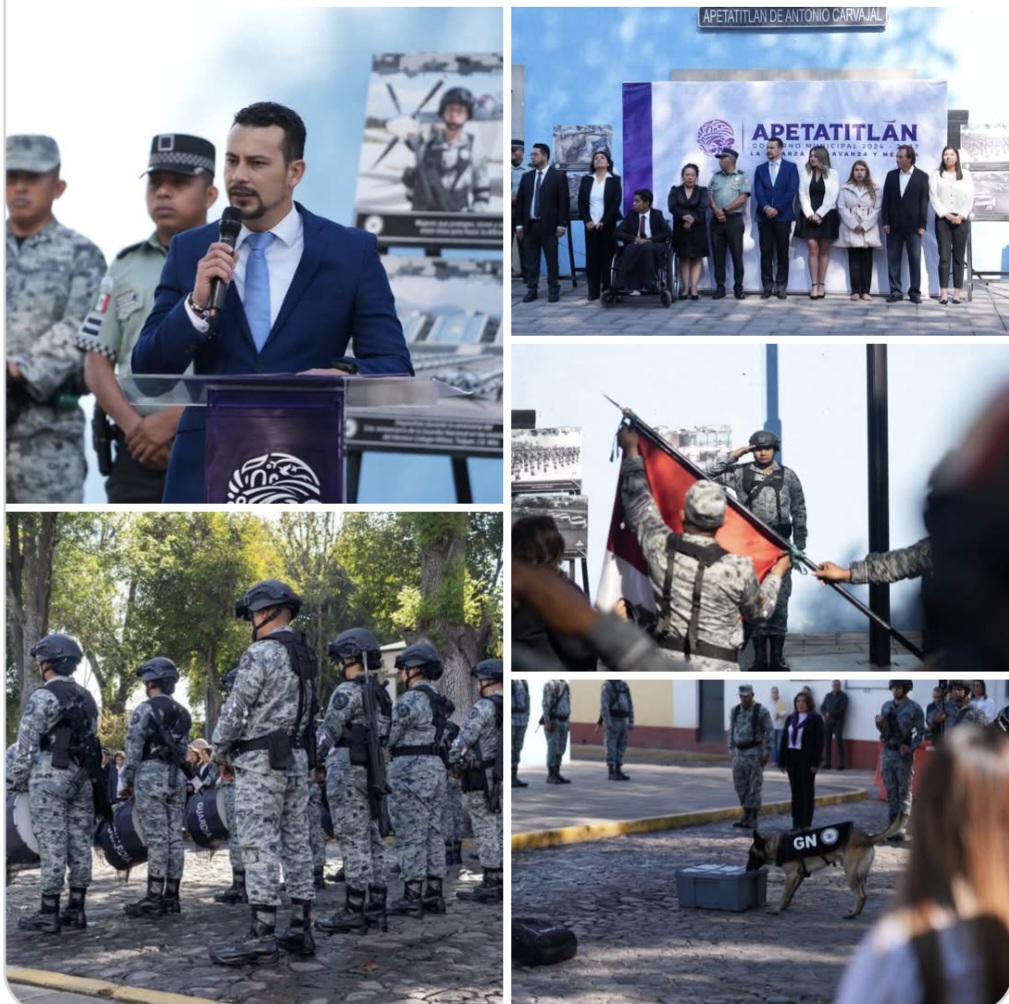 🇲🇽 Esta mañana, en la Plaza Emilio Sánchez Piedras de #Apetatitlán, el presidente municipal, Azaín Ávalos Marbán, y el teniente de la Guardia Nacional, Ezequiel Villalobos Caricia, en representación del Coordinador Estatal, encabezaron un homenaje a los valores cívicos y a la defensa de la bandera nacional, como parte de las acciones de proximidad social entre la corporación y el Ayuntamiento.