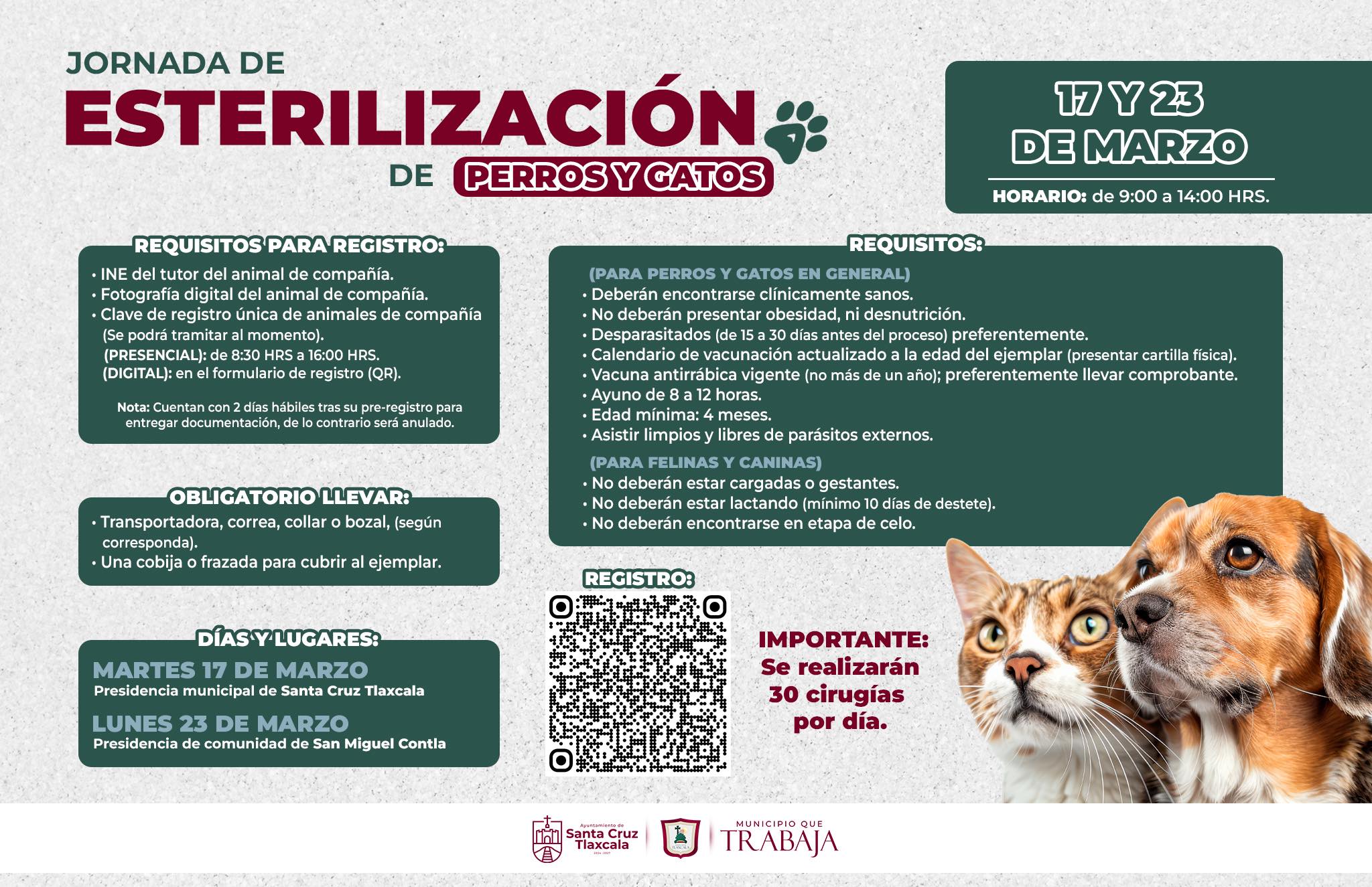 El Gobierno Municipal de Santa Cruz Tlaxcala, a través de la Unidad Municipal de Protección al Medio Ambiente y en coordinación con Bienestar Animal del Estado de Tlaxcala, invita a la ciudadanía a participar en la Jornada de Esterilización que se llevará a cabo los días 17 y 23 de marzo en el municipio.